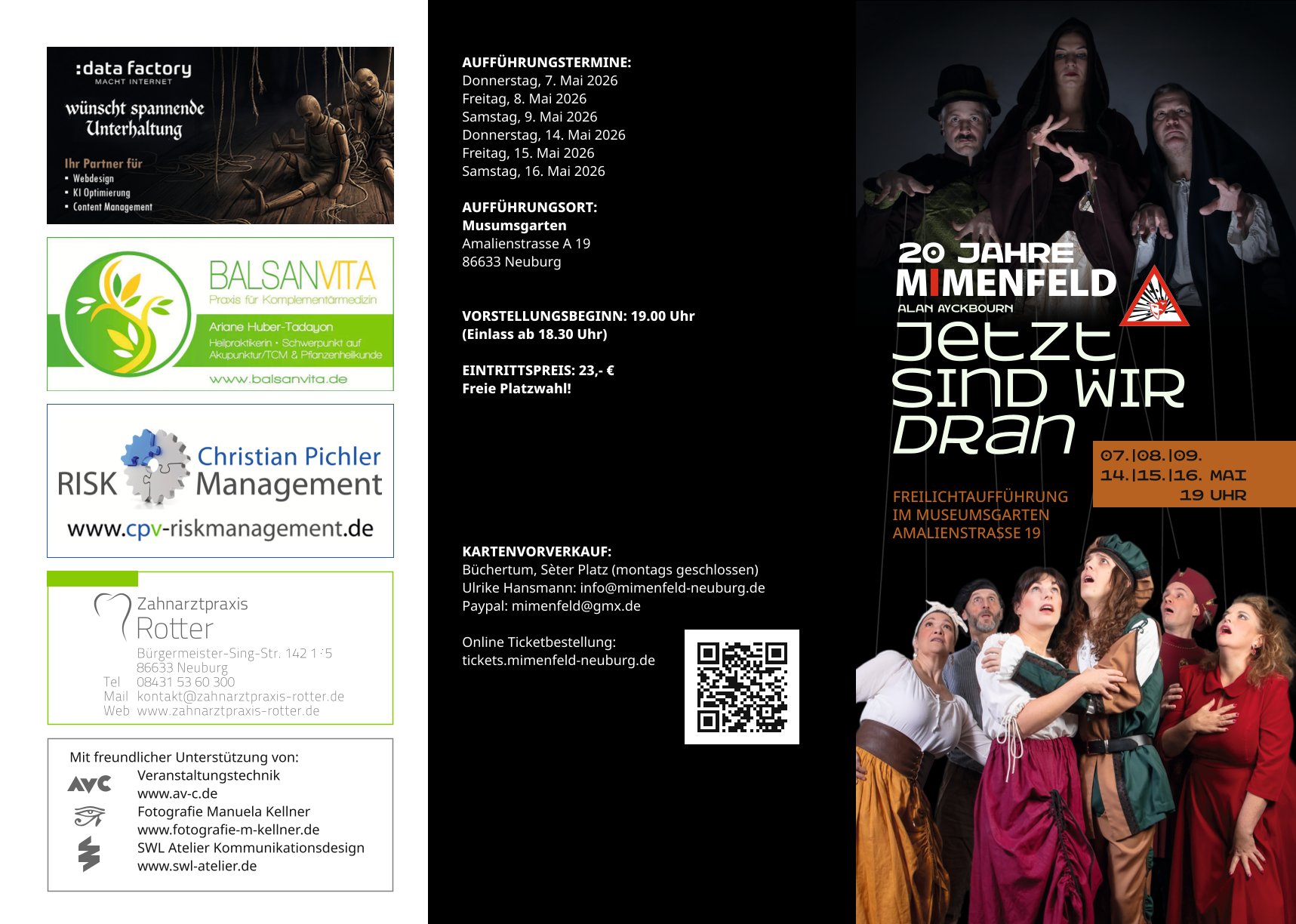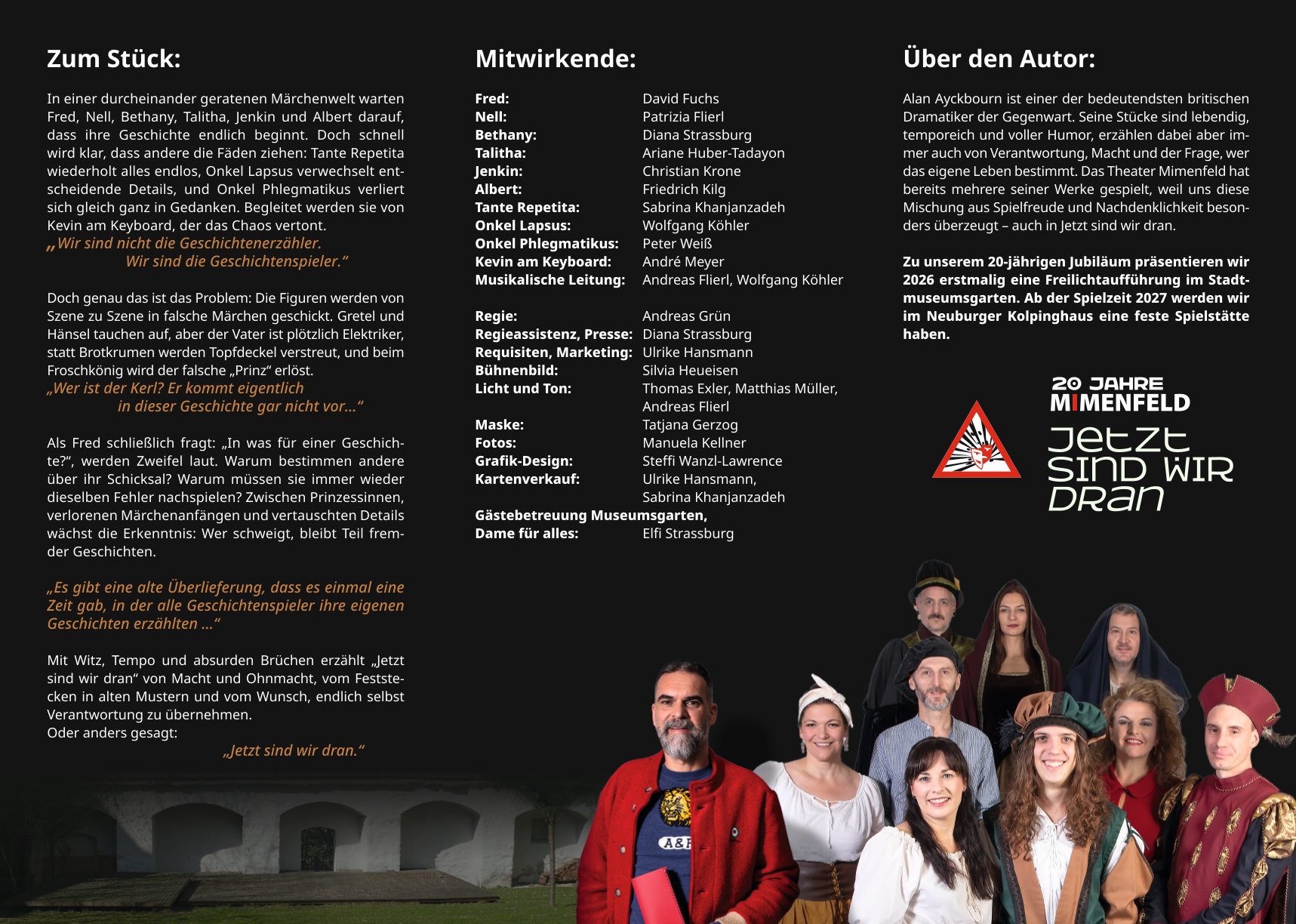 20 Jahre Mimenfeld! Das muss gebührend gefeiert werden. Deswegen veranstalten wir erstmals ein Freilichttheater im Stadtmuseumsgarten (Weveldhaus). Ab Donnerstag 07.05.26 bringen wir insgesamt sechs Mal die irrwitzige Märchenkomödie "Jetzt sind wir dran" von Alan Ayckbourne auf die Bühne.