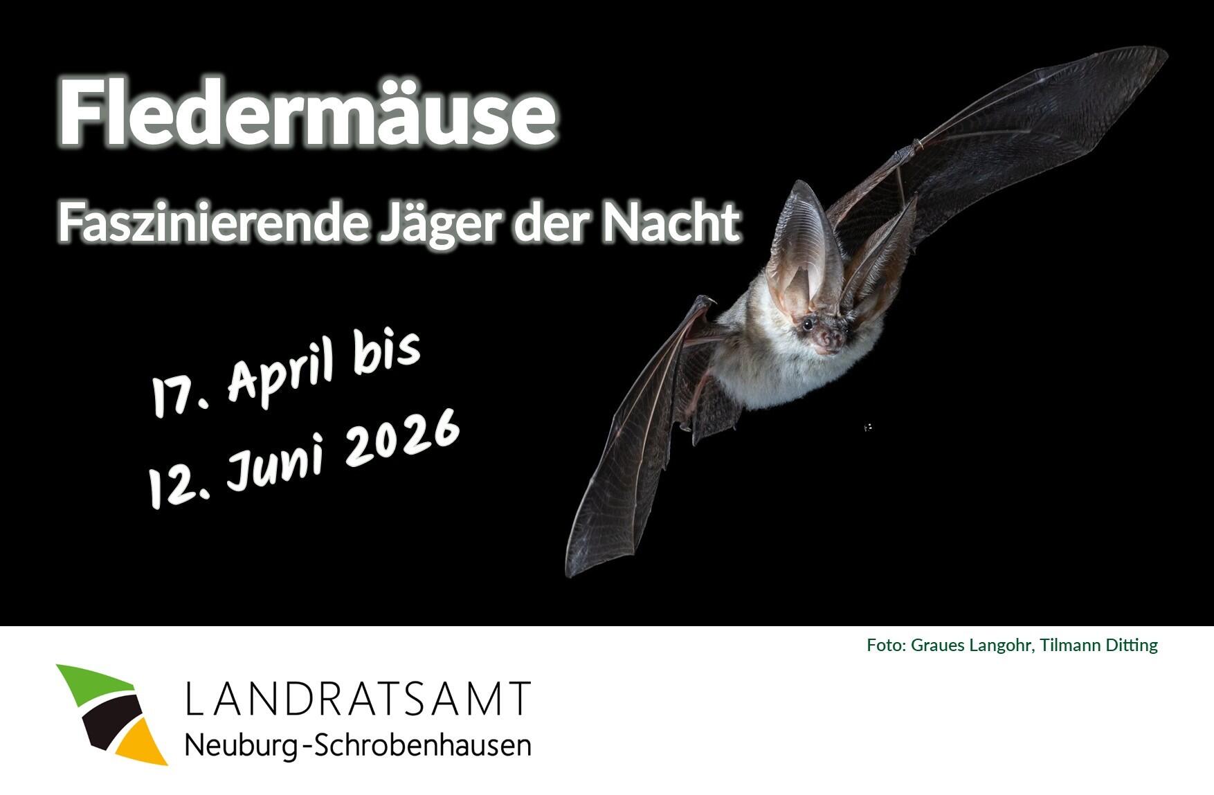 Bald sind die nächtlichen Flugkünstler im Landratsamt zu finden. Die große Ausstellung „Fledermäuse - Faszinierende Jäger der Nacht“ kann vom 17. April bis 12. Juni zu den Öffnungszeiten besichtigt werden. Es sind viele interessante Exponate zu entdecken, von Fledermaus-Präparaten bis hin zum ehrenamtlichen Engagement im Landkreis. Ob jung oder alt – die Ausstellung bietet für alle etwas und lässt sich in 30 bis 60 Minuten entdecken.